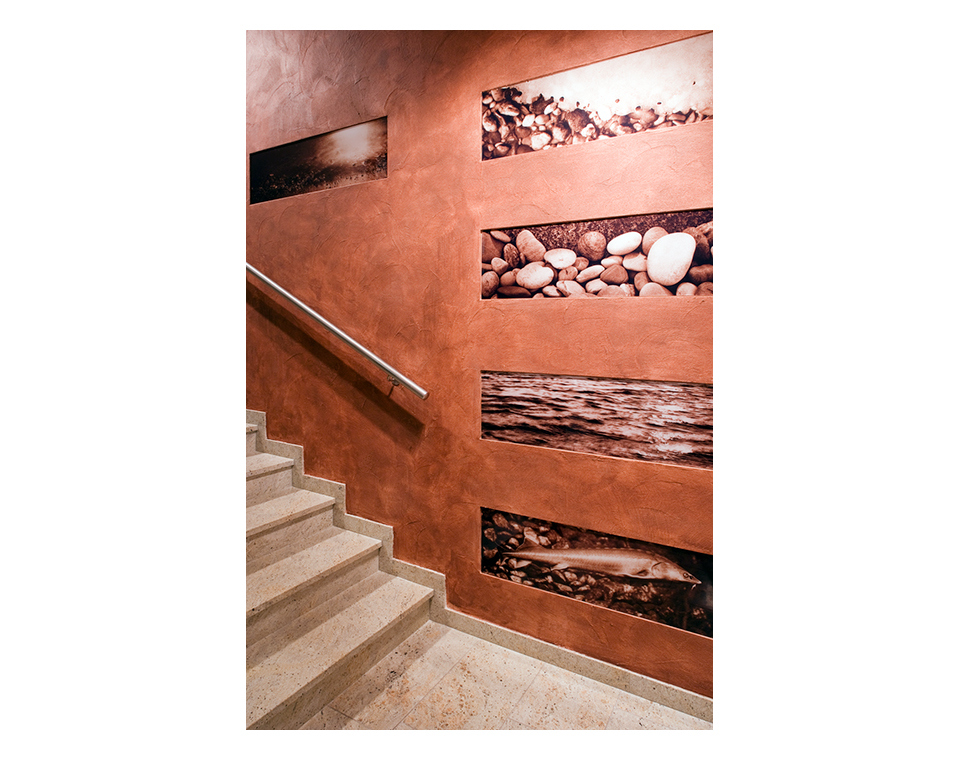 Permanent public art installation, Emmersdorf on the Danube council building, Lower Austria 2006 <br><br> In August 2002 the town of Emmersdorf was inundated with floodwaters from the Danube river. As part of the post-flood renovations, a permanent - art in public space - installation was included in the council chamber's building. <br><br> The concept is to present visitors, accessing the various chamber offices via stairs or a glass-paned lift, with a series of photographs depicting elements characteristic of Emmersdorf's natural environment. Starting from below water-level of the omnipresent Danube river, upward above the surface and onward through the fields and forest to the horizon and back to tree-tops reflected in water. <br><br> The municipal hall on the top floor features a large photograph of Emmersdorf's reflection in the Danube river. This view functions as a pleasant reminder that despite the threat of flooding, the town always remains the proud and beautiful Western door to the World heritage Wachau valley. The 300x230cm image is on permanent display, only to be replaced when the in-built projection screen is in use. <br><br> 12 digital C prints mounted with acrylic face & aluminium backing - 100x30cm <br> Inkjet print on canvas mounted over stretcher frame - 300x230cm