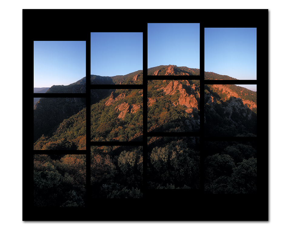 Proof ~ solo exhibition, Vienna Austria 2003 <br><br> What is PROOF? <br> proof (proof), n. the act of proving, a test, a trial; testing, assaying, experiment, demonstration…a first or early impression of a photograph…(Cassell Concise English Dictionary) <br><br> In darkroom technique after processing a roll of film, a PROOF of all images is made by trimming the film into strips so the complete roll fits a standard sheet of photographic paper, (eg. 25x20cm also a common large format sheet film size) laying the film on the paper and covering with glass so the film is in direct contact with the paper, then exposing so as to average all frames, allowing easy selection of images for enlargement in a positive form. <br><br> Exposing a complete roll of film in sequence with the final proof sheet in mind, creates a large format final image containing many individual compositions and more potential to make mistakes...for better or worse. With an increasing ease of access to photography through digital media, countless multiple image techniques have developed. Anything is possible and it's probably all been done before sometime, somewhere by someone. Time to go back to an emphasis on subject and composition with the anticipation of seeing a complete roll of processed film as PROOF. <br><br> <br><br> So what am I trying to prove? <br> Originally intended to greatly minimise or eliminate the need for correction before printing, I wanted to revisit an old idea and realise the concept of "the poor man's large format" by utilising a complete roll or sequence of film as original then printing large digitally. <br><br> Inkjet print on Artistex, wooden stretcher frame 180x150cm