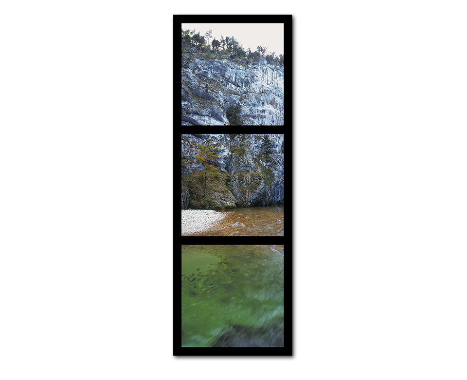 Proof ~ solo exhibition, Vienna Austria 2003 <br><br> What is PROOF? <br> proof (proof), n. the act of proving, a test, a trial; testing, assaying, experiment, demonstration…a first or early impression of a photograph…(Cassell Concise English Dictionary) <br><br> In darkroom technique after processing a roll of film, a PROOF of all images is made by trimming the film into strips so the complete roll fits a standard sheet of photographic paper, (eg. 25x20cm also a common large format sheet film size) laying the film on the paper and covering with glass so the film is in direct contact with the paper, then exposing so as to average all frames, allowing easy selection of images for enlargement in a positive form. <br><br> Exposing a complete roll of film in sequence with the final proof sheet in mind, creates a large format final image containing many individual compositions and more potential to make mistakes...for better or worse. With an increasing ease of access to photography through digital media, countless multiple image techniques have developed. Anything is possible and it's probably all been done before sometime, somewhere by someone. Time to go back to an emphasis on subject and composition with the anticipation of seeing a complete roll of processed film as PROOF. <br><br> <br><br> So what am I trying to prove? <br> Originally intended to greatly minimise or eliminate the need for correction before printing, I wanted to revisit an old idea and realise the concept of "the poor man's large format" by utilising a complete roll or sequence of film as original then printing large digitally. <br><br> Inkjet print on Artistex, wooden stretcher frame 70x200cm