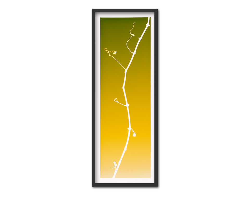 Unique photograms of Wachau wine <br><br> A photogram is a fixed shadow of a three-dimensional object on light-sensitive material, creating a unique picture without the use of film or a camera. The result is a negative image. After briefly being exposed to light and subsequently developed in photographic chemicals, the unexposed parts of the paper which are shielded by the subject matter remain white or lighter than the background. <br><br> The photogram technique is at least as old as the existence of photosensitive surfaces and is easily practised in the darkroom with black and white paper. To produce this series of wine photograms, it was not only necessary to work at night but also to specifically develop several black frame boxes to transport and house the paper during exposure. With careful and precise handling, archival colour photographic paper was employed, which is normally used to print enlargements from negatives or digital files.