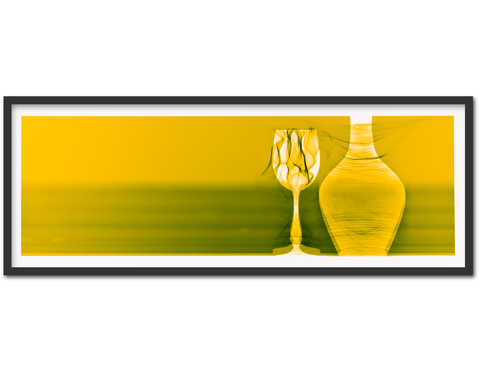 Unique photograms of Wachau wine <br><br> A photogram is a fixed shadow of a three-dimensional object on light-sensitive material, creating a unique picture without the use of film or a camera. The result is a negative image. After briefly being exposed to light and subsequently developed in photographic chemicals, the unexposed parts of the paper which are shielded by the subject matter remain white or lighter than the background. <br><br> The photogram technique is at least as old as the existence of photosensitive surfaces and is easily practised in the darkroom with black and white paper. To produce this series of wine photograms, it was not only necessary to work at night but also to specifically develop several black frame boxes to transport and house the paper during exposure. With careful and precise handling, archival colour photographic paper was employed, which is normally used to print enlargements from negatives or digital files.
