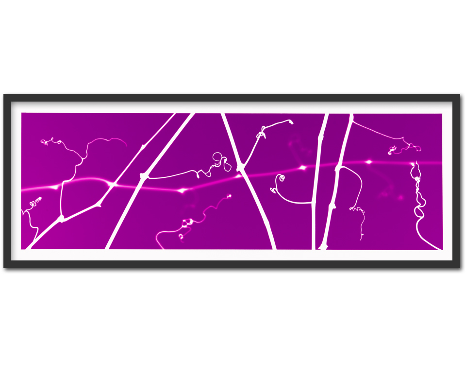 Unique photograms of Wachau wine <br><br> A photogram is a fixed shadow of a three-dimensional object on light-sensitive material, creating a unique picture without the use of film or a camera. The result is a negative image. After briefly being exposed to light and subsequently developed in photographic chemicals, the unexposed parts of the paper which are shielded by the subject matter remain white or lighter than the background. <br><br> The photogram technique is at least as old as the existence of photosensitive surfaces and is easily practised in the darkroom with black and white paper. To produce this series of wine photograms, it was not only necessary to work at night but also to specifically develop several black frame boxes to transport and house the paper during exposure. With careful and precise handling, archival colour photographic paper was employed, which is normally used to print enlargements from negatives or digital files.